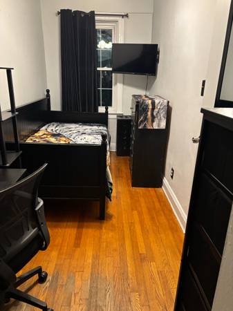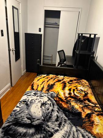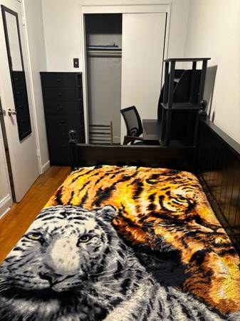 Fully furnished room available with bed, window , ceiling fan , wall desk & chair smart tv and spacious wall in closet and dresser chest