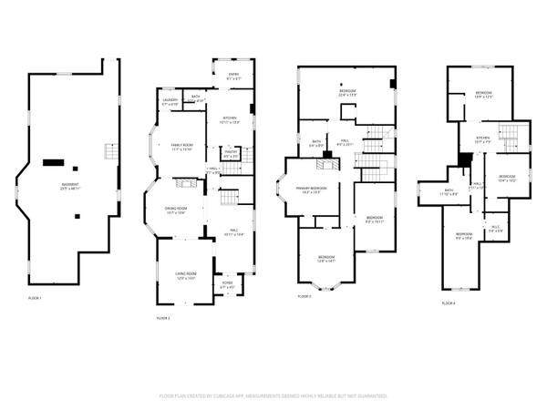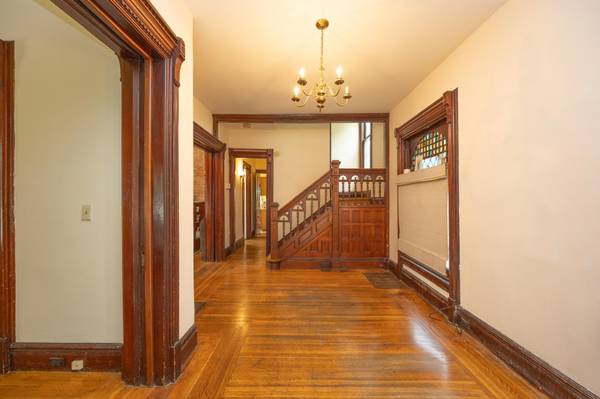 Inside you’ll find a large foyer, a living room with exposed brick and a decorative fireplace, plus a den just off the living room. The home features two kitchens, one on the first floor and another on the third floor.