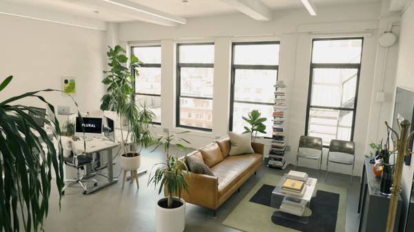 + Biophilic, modern design (plants, trees, natural light, high ceilings, concrete flooring, city views)