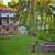 Fully fenced shared garden with fire pit, loge areas, landscaped dining space