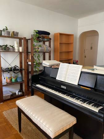 The living room has a couch and an upright piano. I play the piano most days. I’m not open to a television, but plan to get a projector. I know the walls in the pictures look bare — I’m planning to get some artwork framed and put it up!